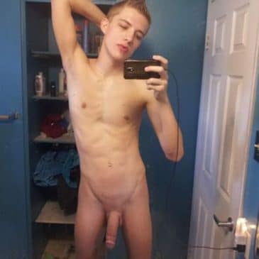 This cute boy with a pretty face is posing his hot naked body in front of a mirror and shows his fat dick